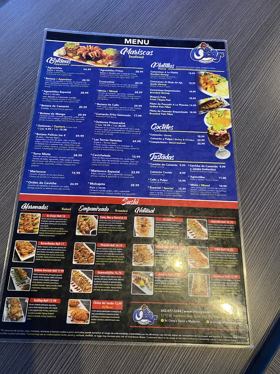 Welcome to Sr Ozzy's Tacos Y Mariscos, a delightful culinary haven located at 1717 W Southern Ave, Phoenix, AZ. Here, the menu captivates with vibrant flavors that honor traditional Mexican cuisine.